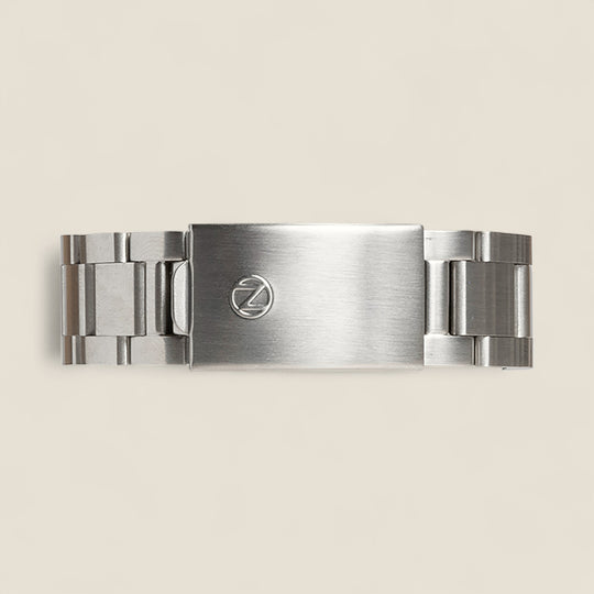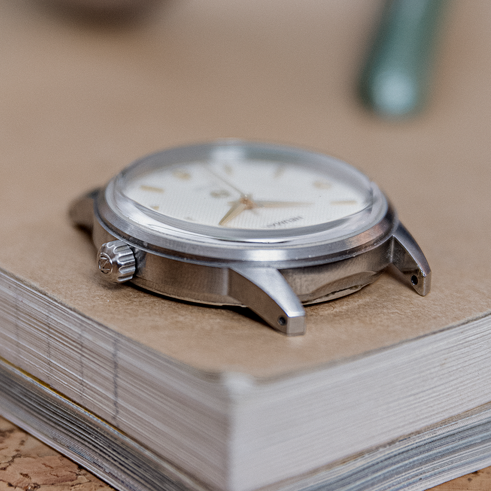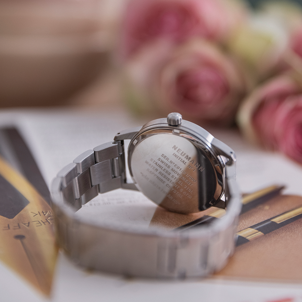Neumann watches are built with brushed 316L stainless steel and a domed, scratch-resistant sapphire crystal. The caseback and crown feature subtle, engraved branding that adds quiet distinction.