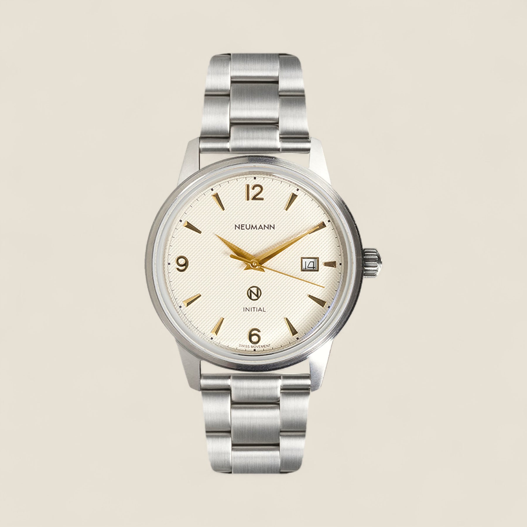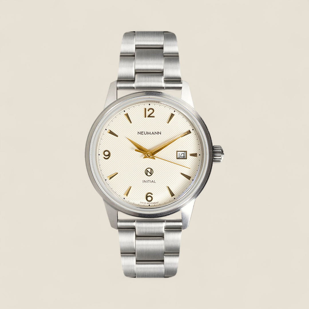 With its warm off-white dial and brushed steel case, this 40 mm edition of the Initial Nº 1 offers a refined contrast of softness and structure. The golden hands introduce a quiet warmth, while the raised sapphire crystal adds depth and clarity to the dial. Designed in Sweden and assembled in Germany, it is a watch made not to compete for attention, but to complement the wearer with calm assurance.