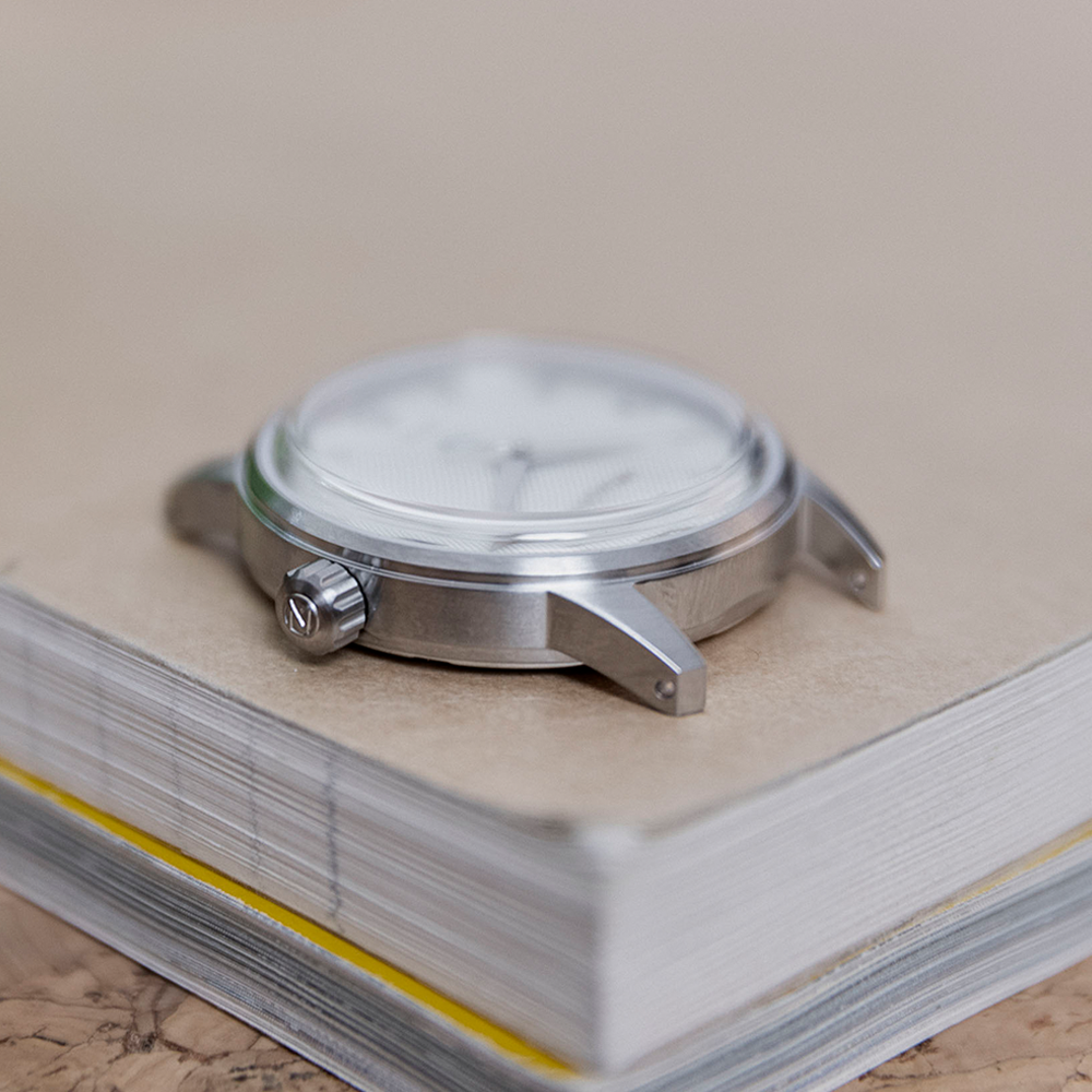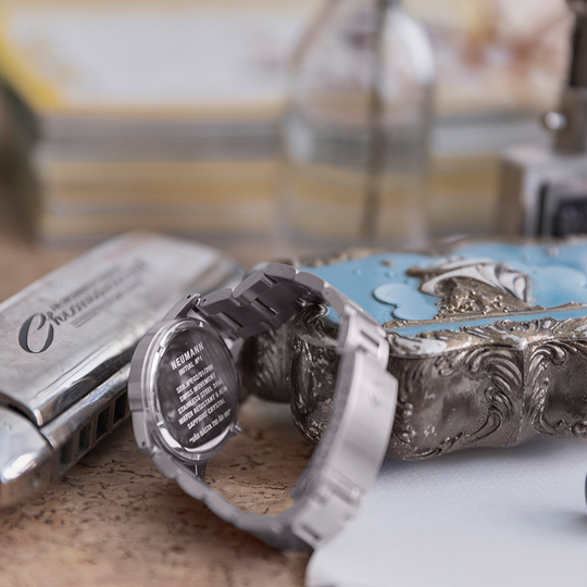 Neumann watches are built with brushed 316L stainless steel and a domed, scratch-resistant sapphire crystal. The caseback and crown feature subtle, engraved branding that adds quiet distinction.