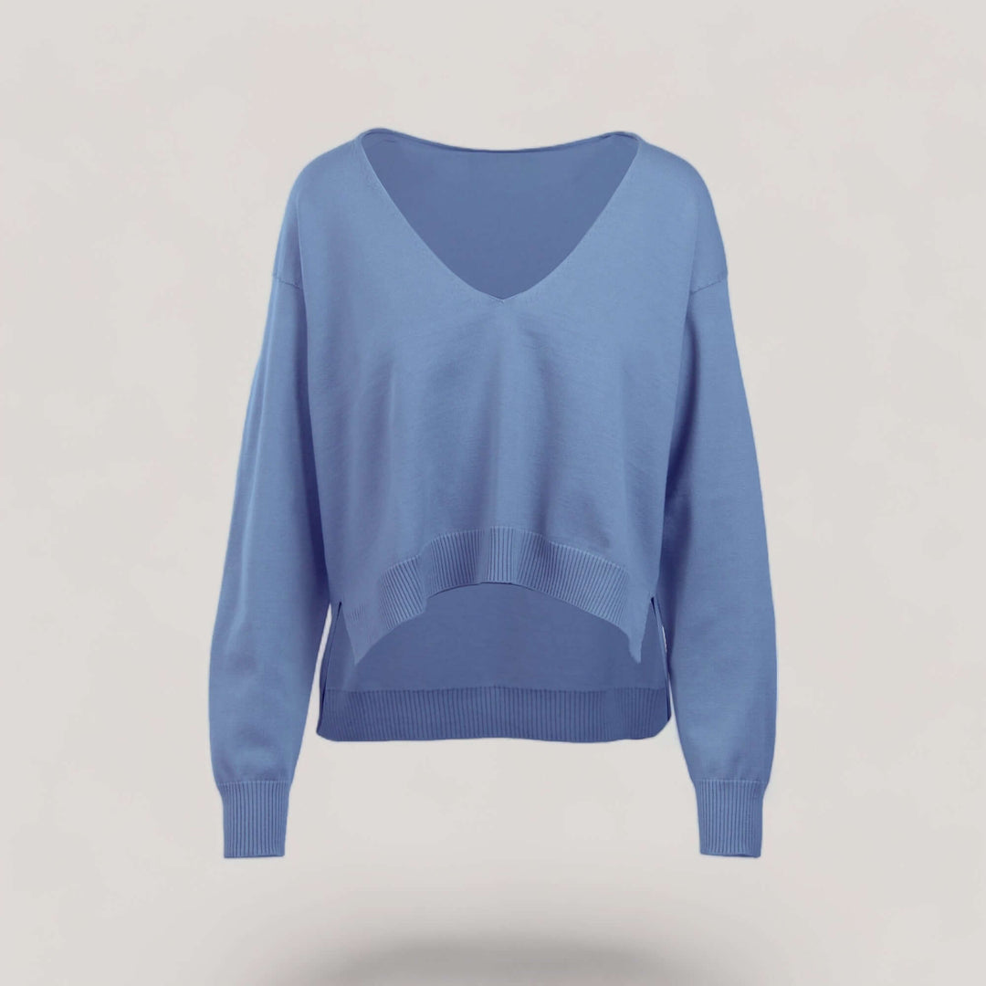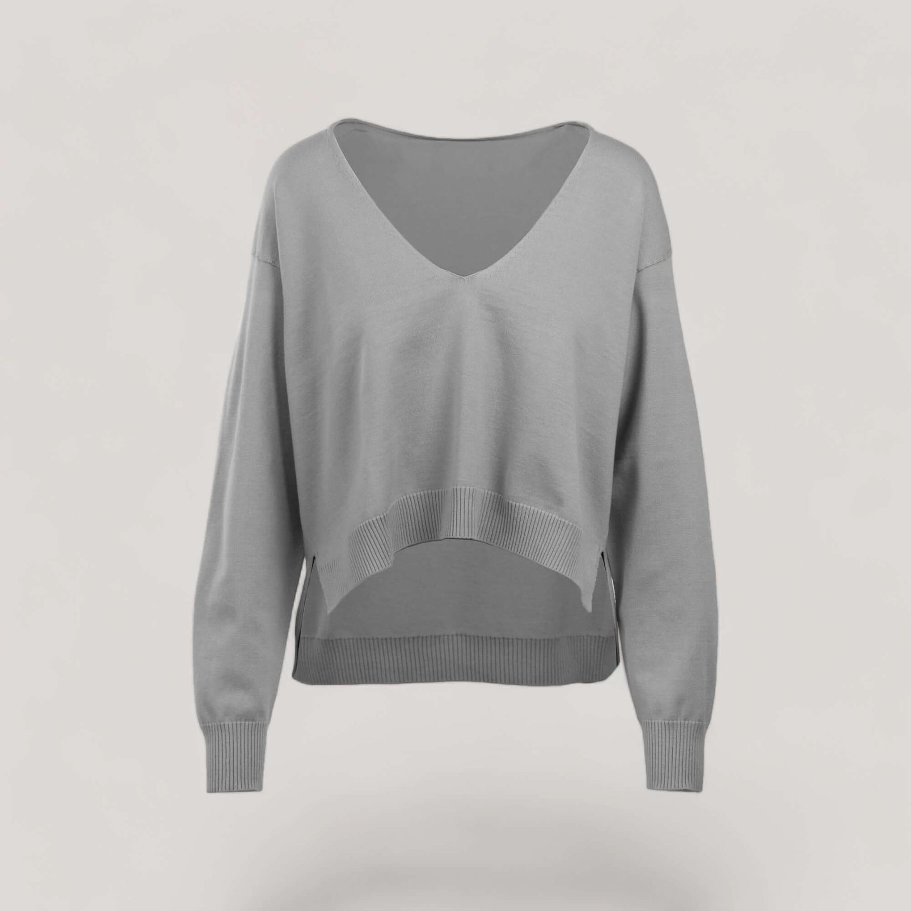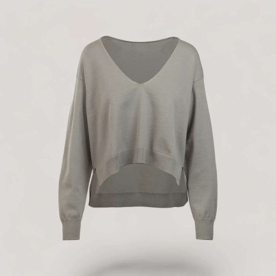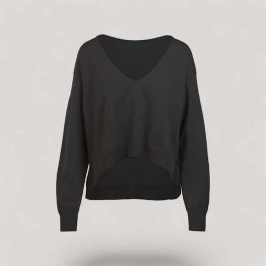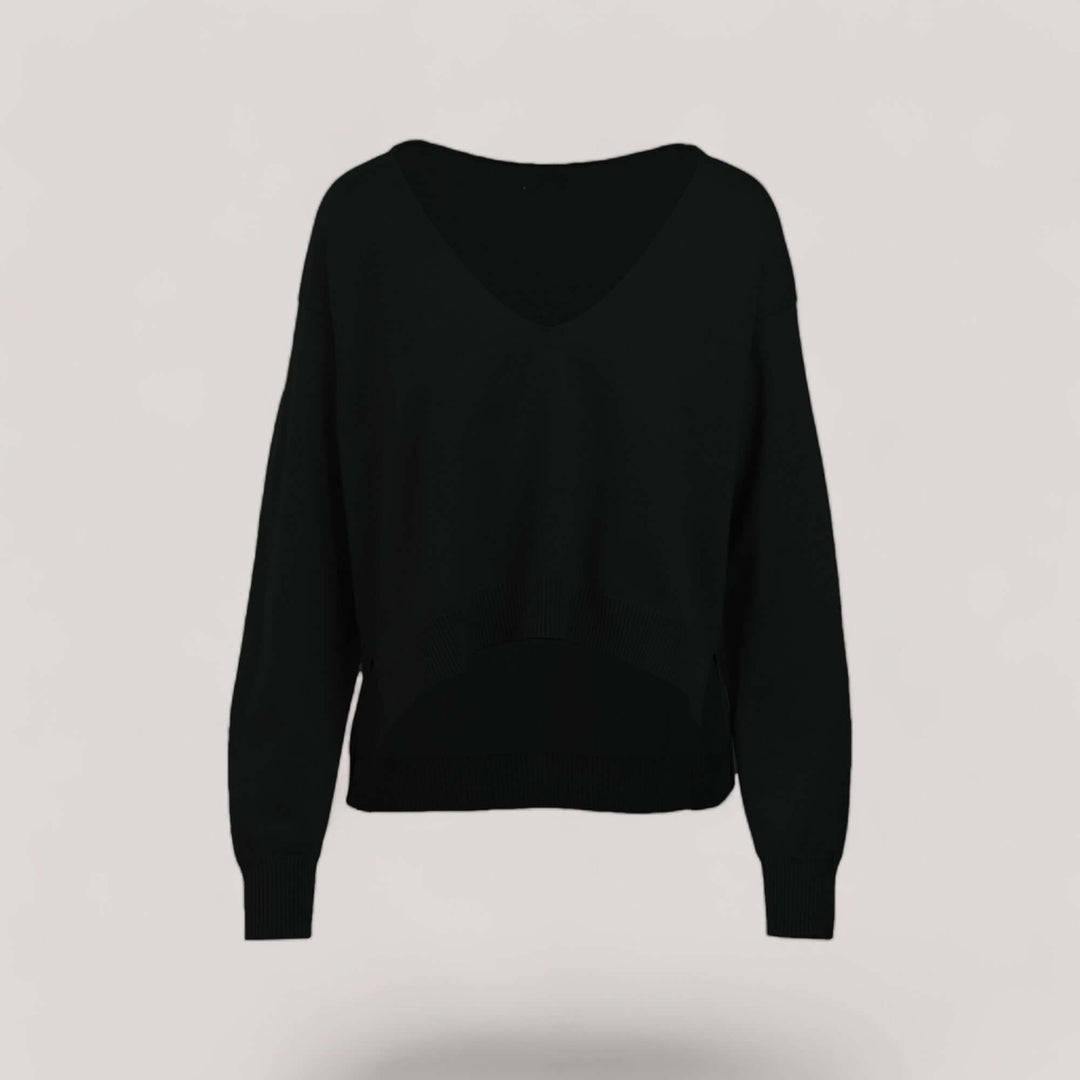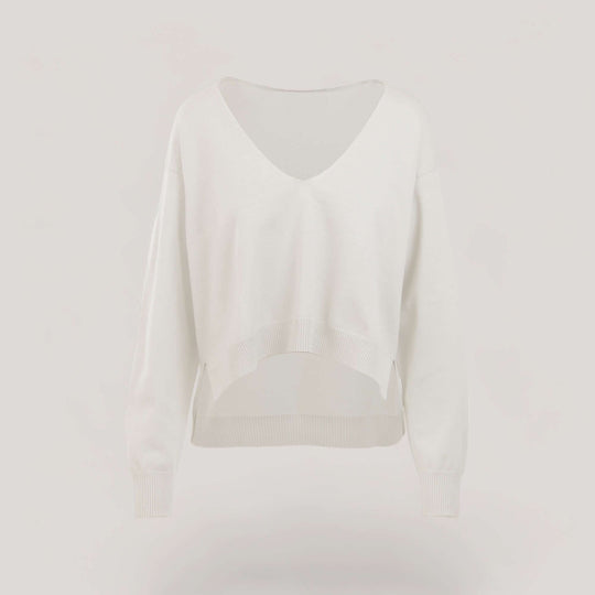 Embrace a blend of minimalist design and versatile functionality with the CARMEN Boxy Cropped V-Neck Sweater. Its relaxed silhouette, accented by a wide and low V-neck alongside high/low side slits, sets a foundation for contemporary style. Crafted for comfort across seasons, this piece pairs effortlessly with essentials like the Greta skirt, embodying a refined yet relaxed oversized aesthetic.