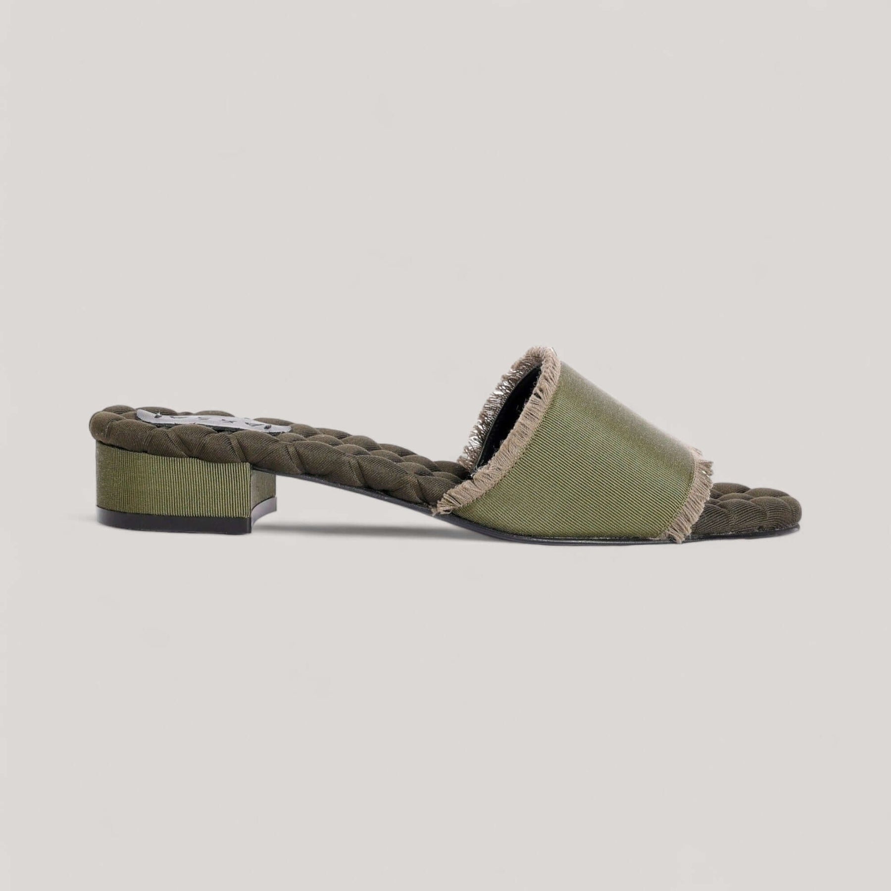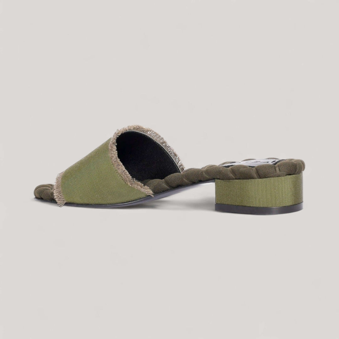 La sandalia Giorgia de AERA presenta un color verde militar que se adapta sin esfuerzo del día a la noche y brinda elegancia y comodidad. La incorporación de flecos de grosgrain le aporta refinamiento y un toque distintivo. Con un tacón cuadrado que se suma a la familia de los tacones tipo kitten heel, esta sandalia es elegante y cómoda. Una plantilla acolchada distintiva, un sello distintivo de la marca, garantiza un ajuste y una silueta únicos.