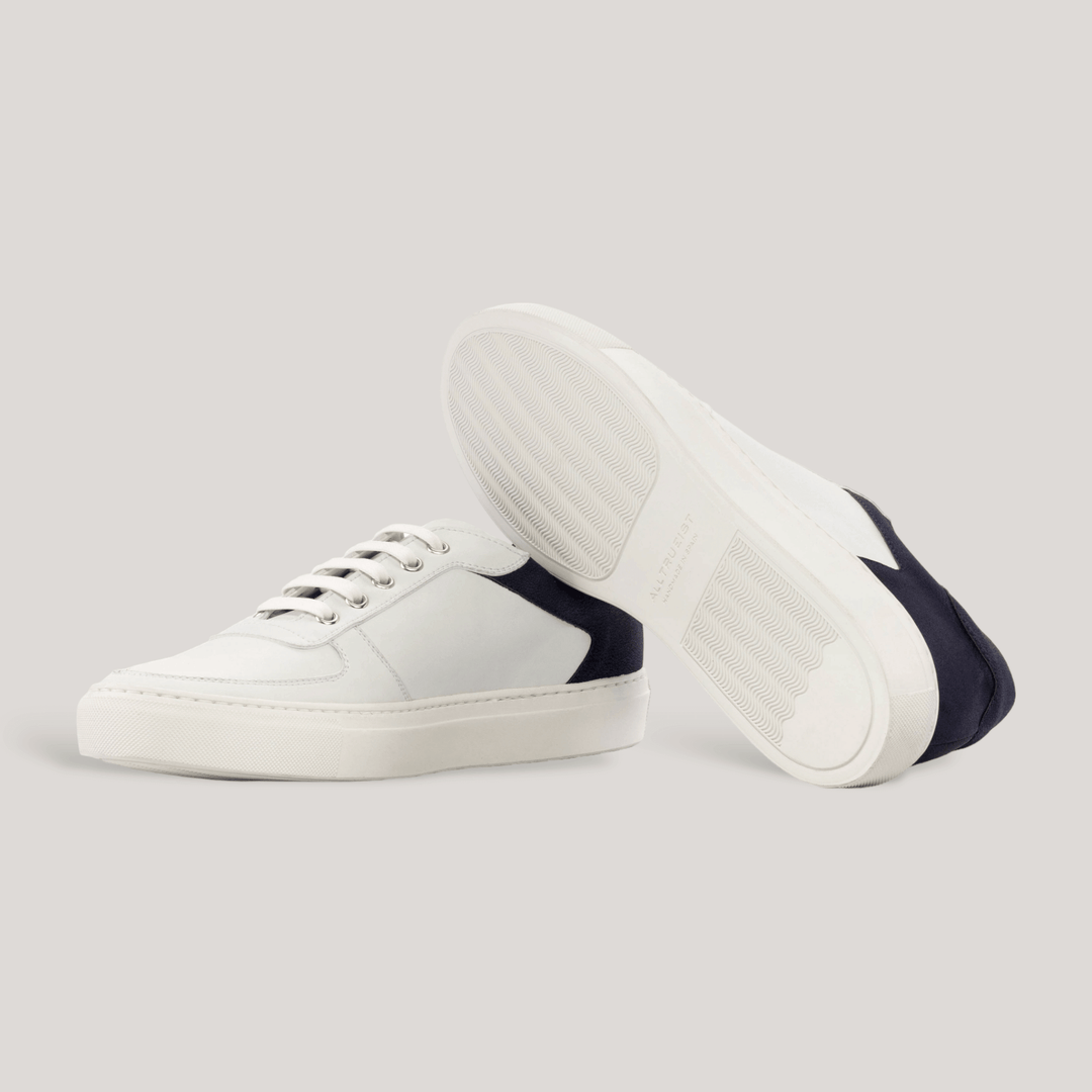 El Avenir de ALLTRUEIST, un destacado calzado deportivo de perfil bajo, aporta un toque moderno a la moda sostenible. Hecho a mano en Alicante, España, este zapato presenta un cuerpo de napa vegana blanca fresca que contrasta con un tacón de ante vegano azul marino, creando un llamativo efecto de bloque de color.