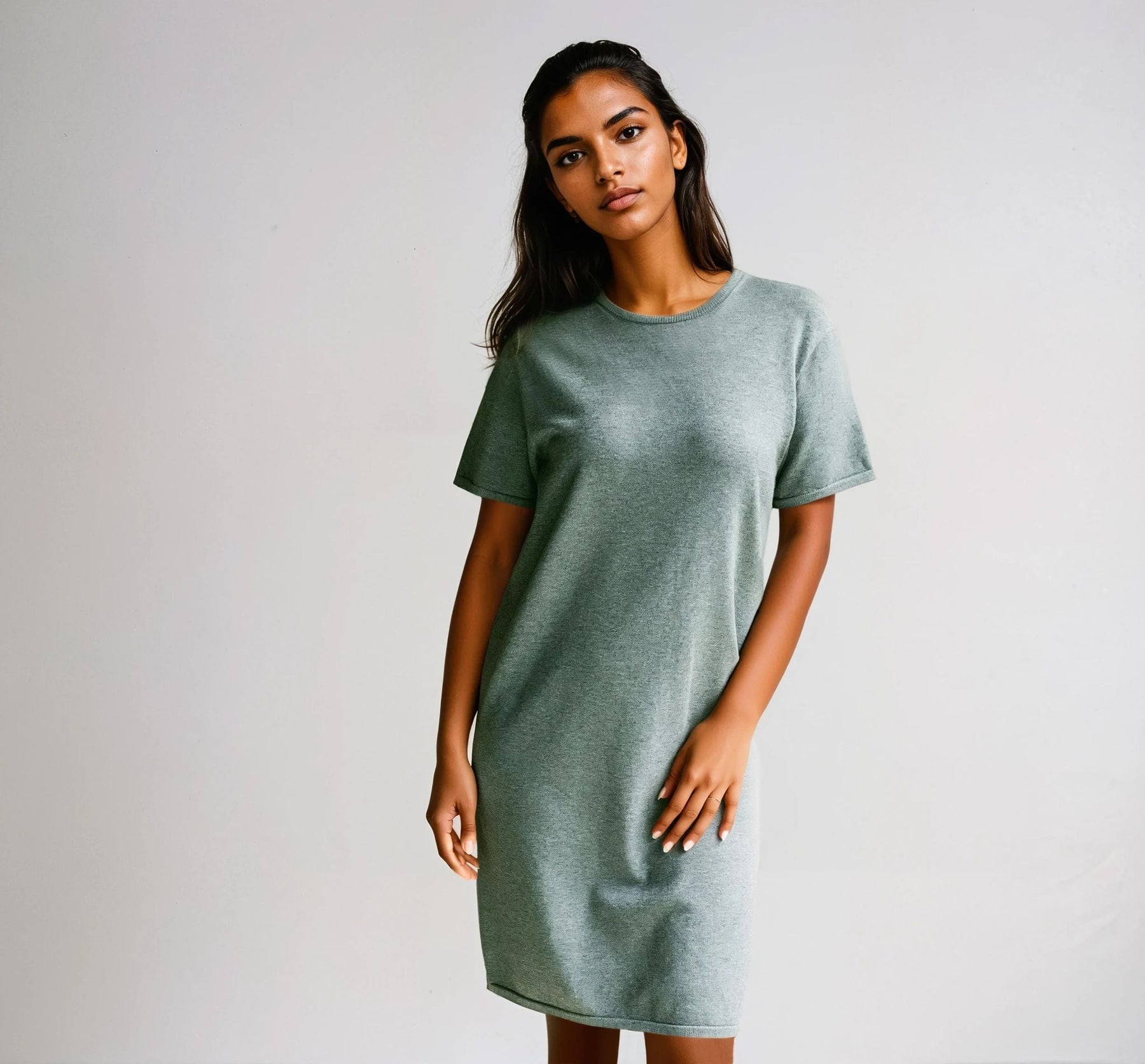 STEFANIA Ecoviscose relaxed T-shirt dress in green, made-to-order luxury knitwear by Maison Alltrueist.