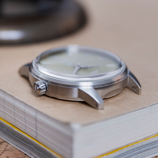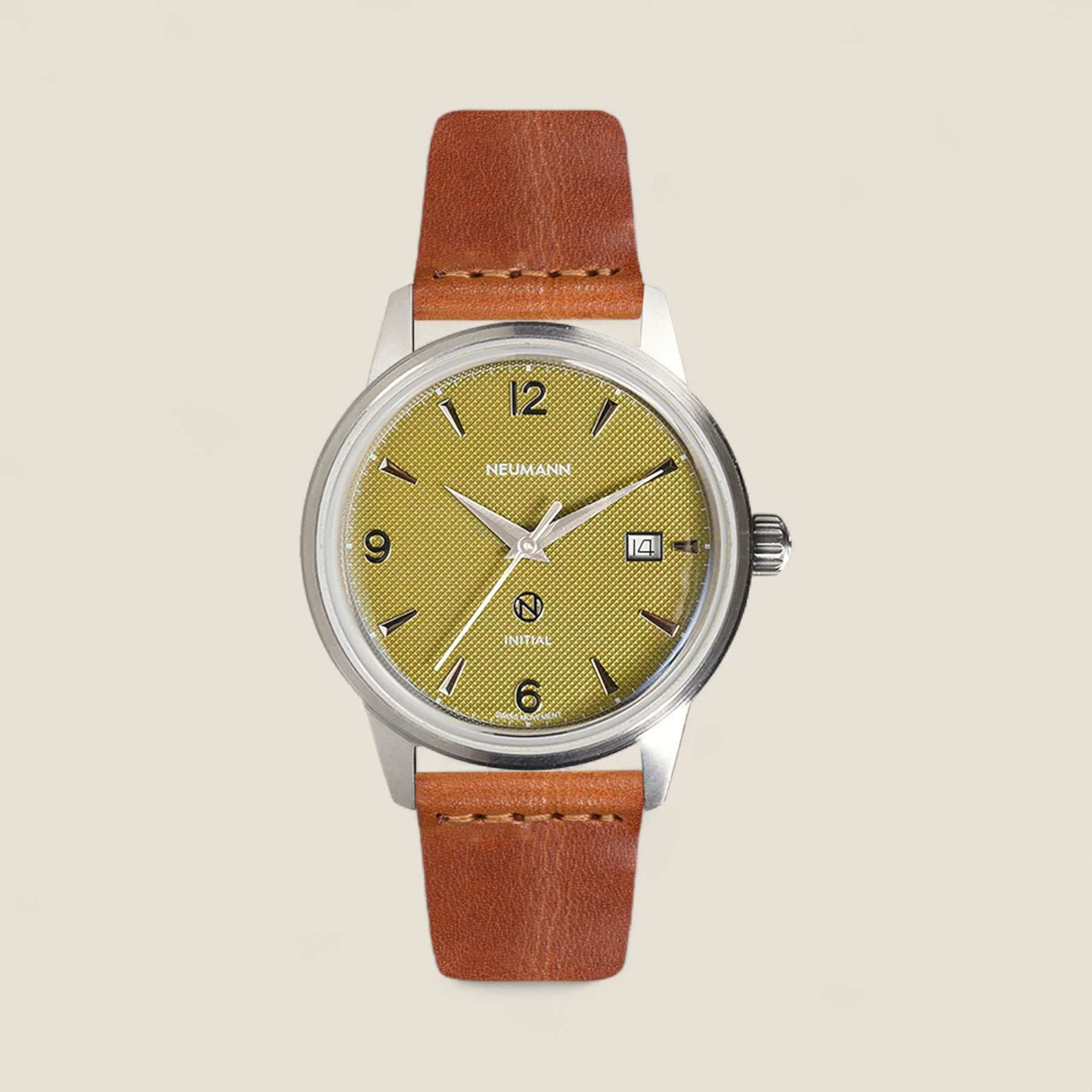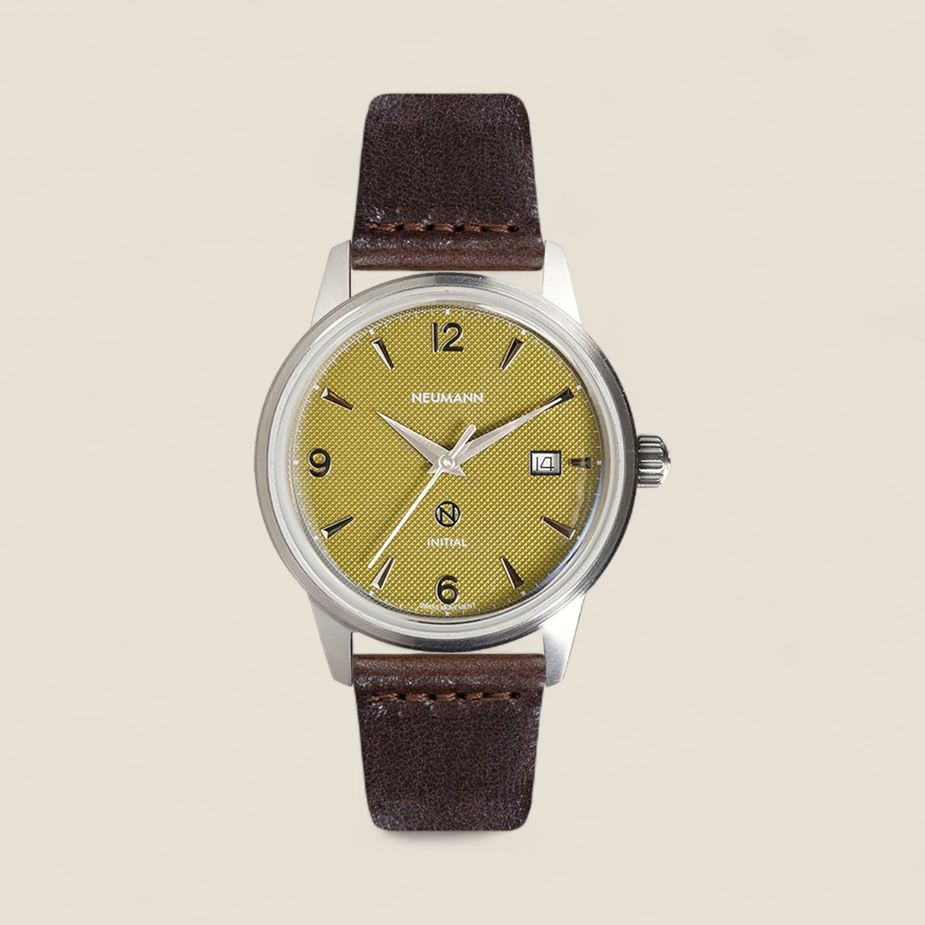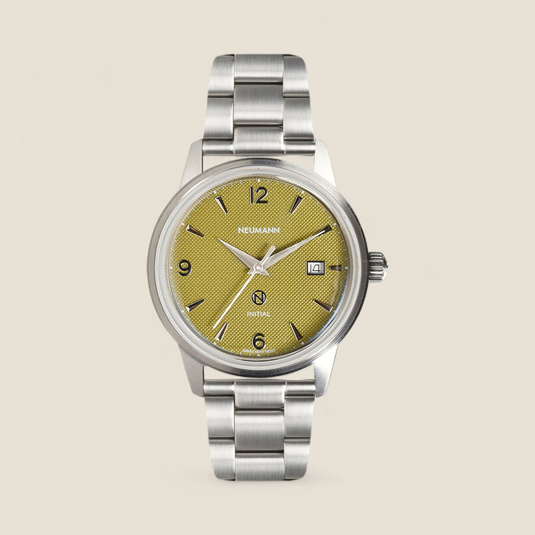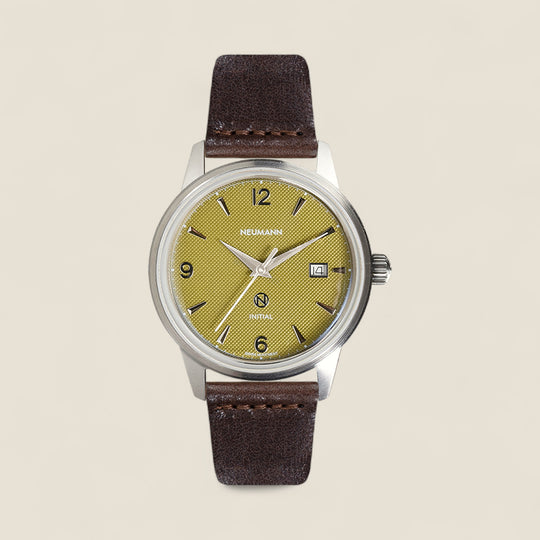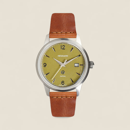 Les montres Neumann sont fabriquées en acier inoxydable 316L brossé et dotées d'un verre saphir bombé résistant aux rayures. Le fond du boîtier et la couronne arborent un logo subtilement gravé qui leur confère une distinction discrète.
