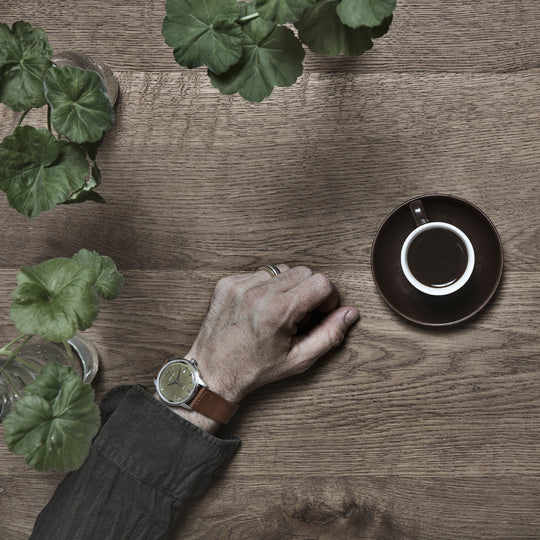 Les bracelets sont disponibles en acier inoxydable brossé ou en cuir tanné végétal provenant de la célèbre tannerie suédoise de Tärnsjö. Le cuir vieillit magnifiquement et acquiert une riche patine au fil du temps.