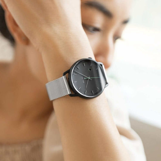 Powered by solar technology, the 10mm recycled stainless steel case offers a 6-month power reserve with only 2 hours of sunlight exposure. Say goodbye to battery replacements and hello to effortless accessorizing with interchangeable straps.