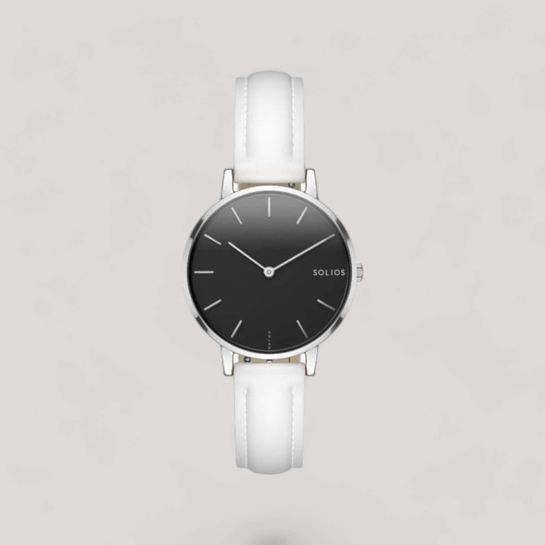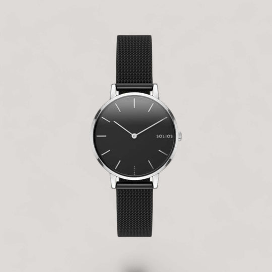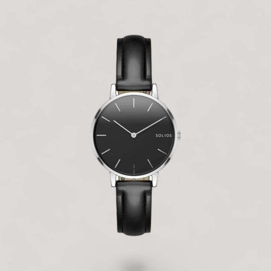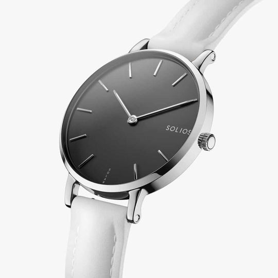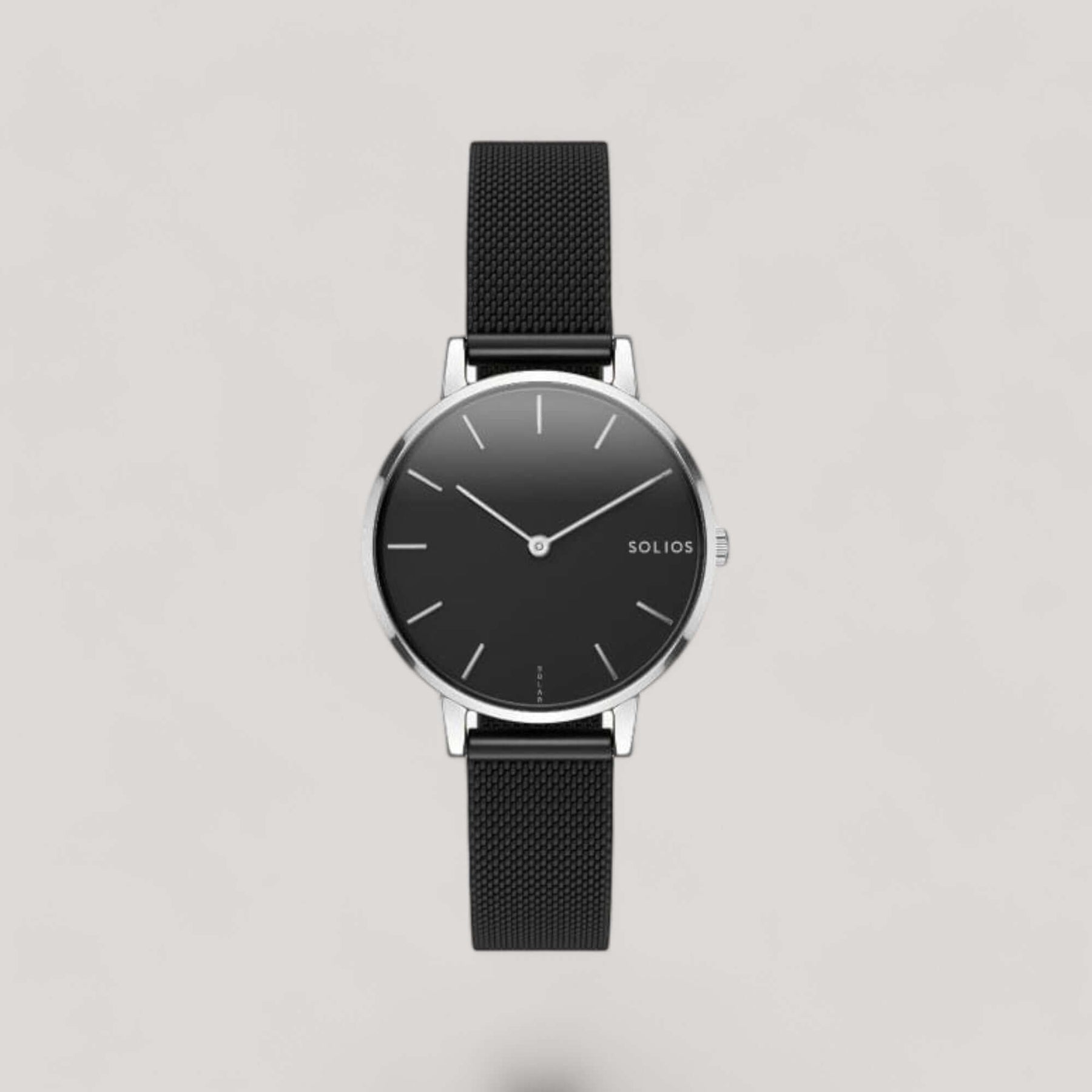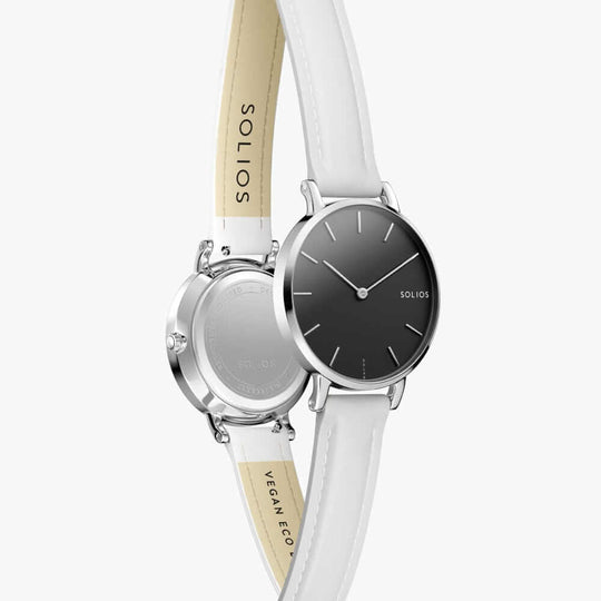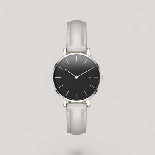 The Silver and Black Solar Mini by Solios is a perfect blend of fashion and sustainability. Its slim 6.5mm recycled stainless steel case and pristine white dial showcase elegance and eco-awareness. With water resistance up to 3 ATM and scratch protection from hardened mineral glass and sapphire crystal coating, this miniature marvel is ready for everyday adventures.