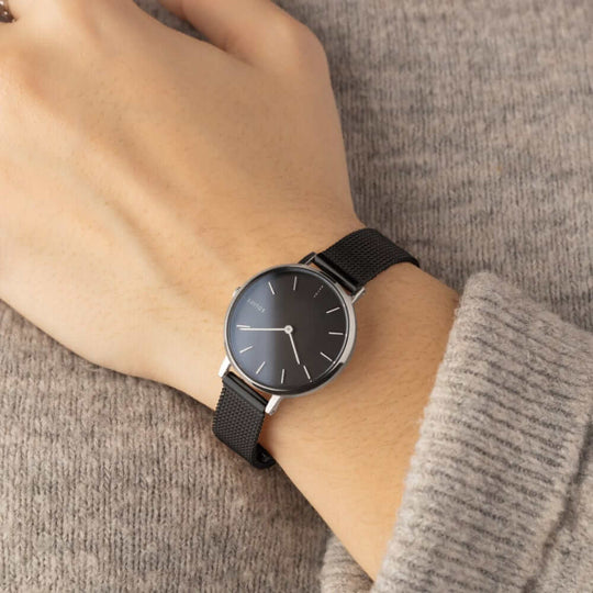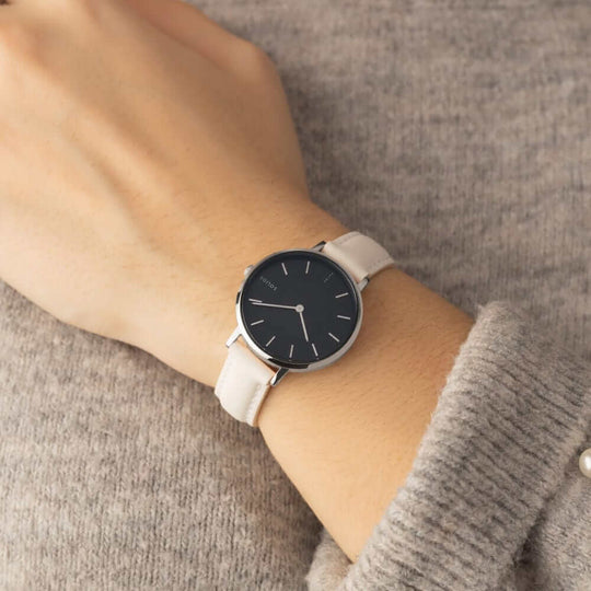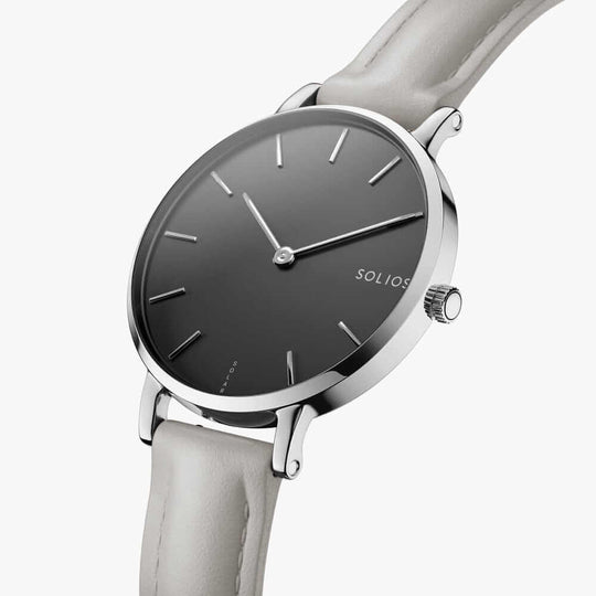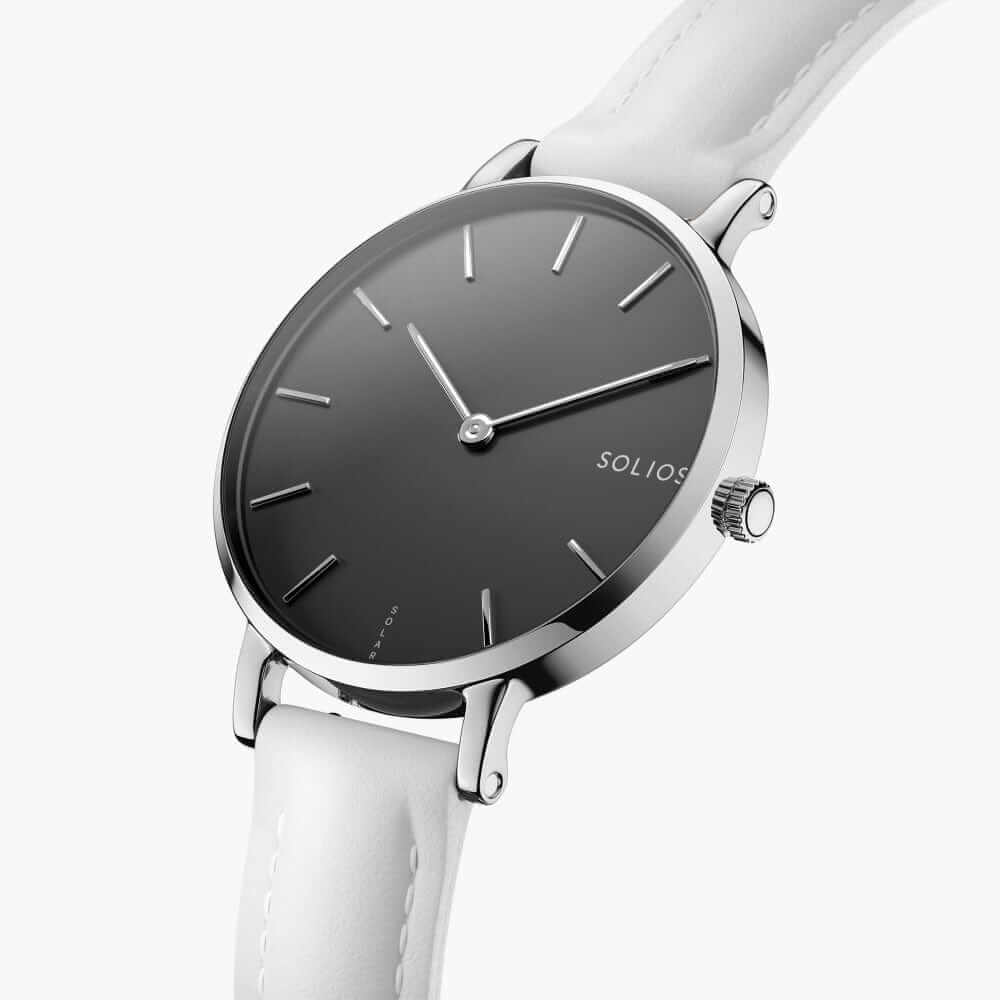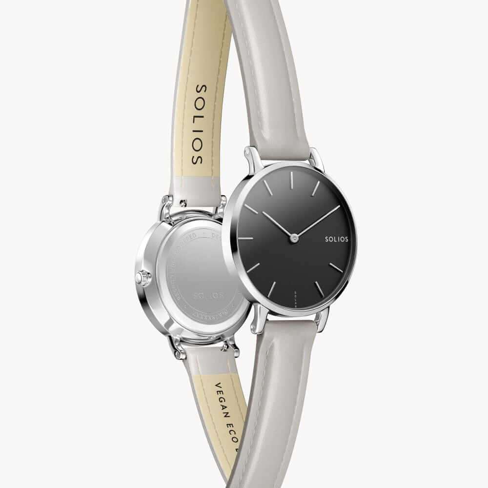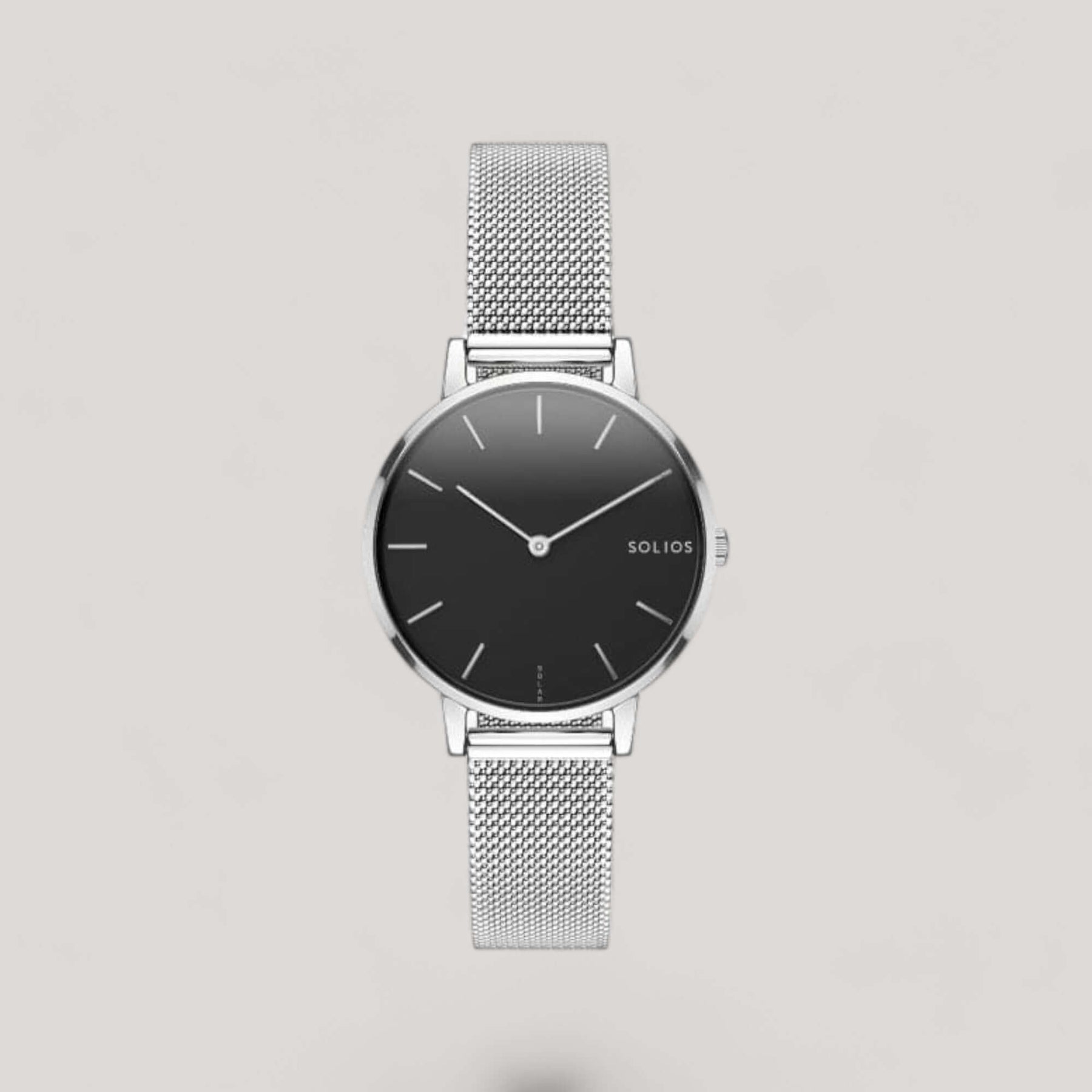 The Silver and Black Solar Mini by Solios is a perfect blend of fashion and sustainability. Its slim 6.5mm recycled stainless steel case and pristine white dial showcase elegance and eco-awareness. With water resistance up to 3 ATM and scratch protection from hardened mineral glass and sapphire crystal coating, this miniature marvel is ready for everyday adventures.